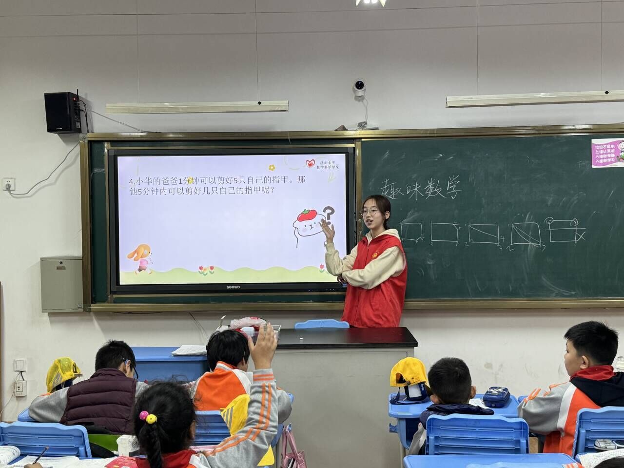 课堂伊始,青年志愿者林昊通过热场小游戏吸引了同学们对今天这堂趣味数学课的兴趣,同学们都积极参与到游戏其中,时而皱眉思考,时而歪着头询问,思绪紧跟着志愿者的讲解,在志愿者们耐心仔细的解答中探索到了数学的魔力。紧接着,几个趣味烧脑的脑筋急转弯活跃了课堂氛围,“3”“5”……一声声抢答尽显同学们对数学的兴趣。黑洞不光天文学里面有,数学也有自己的“黑洞”,志愿者们通过播放视频让同学们初步了解到卡普雷卡尔黑洞,并让同学们写下任意数字后通过自己的计算,找到其中的规律,体会到数字黑洞的神奇。