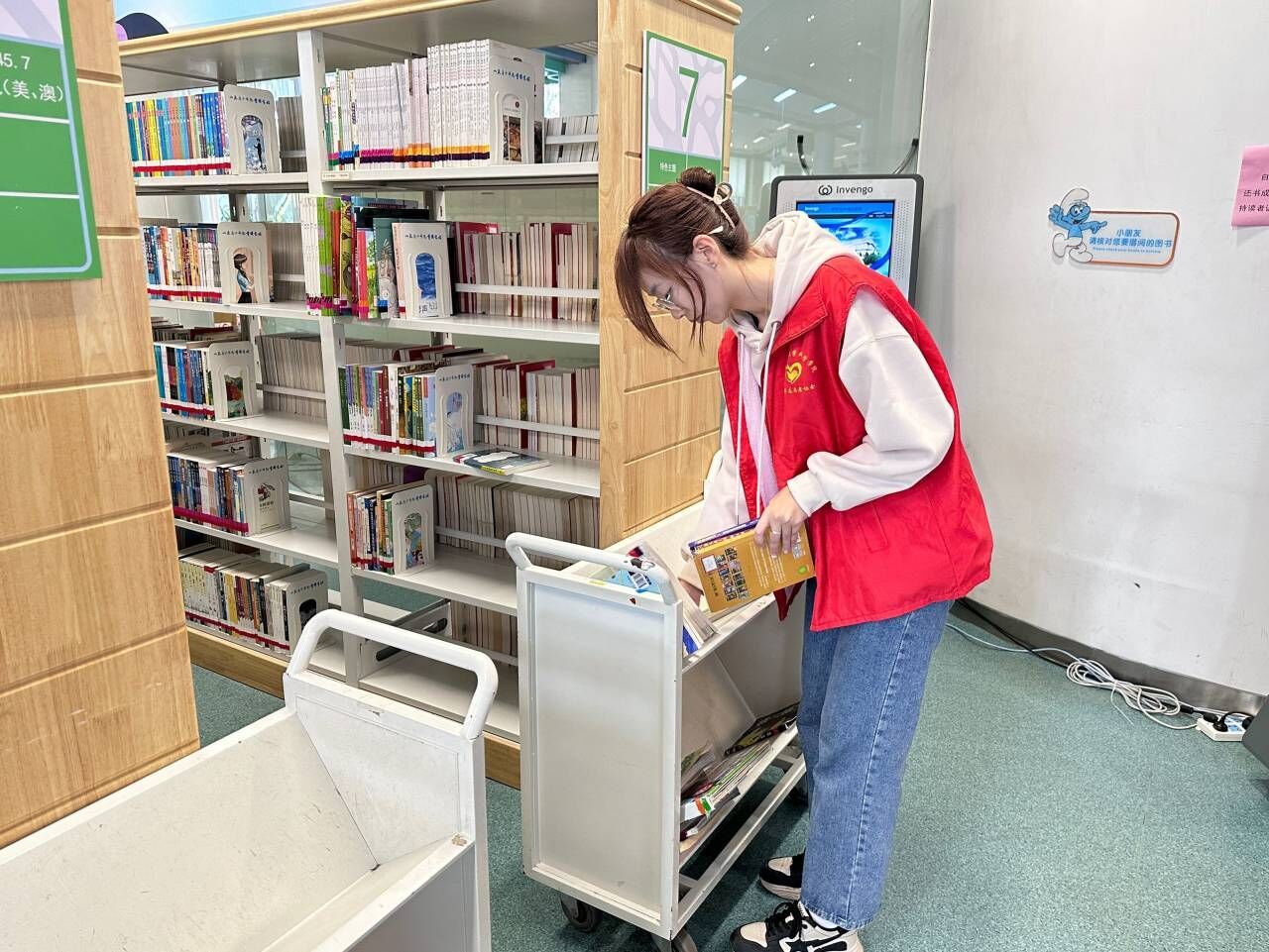 志愿者们身穿红衣,彰显青春风采。伴随书香,他们整齐有序地进入图书馆,认真听取图书管理员的相关要求并分为两队,在不同区域里担起了自己的责任。他们有条不紊,分门别类地将书籍放入相应的书柜;他们毫不懈怠,将桌椅排放得整齐有序;他们坚持到底,直到闭馆的前一刻仍坚持做好自己的工作。小朋友们在他们的帮助下更好地感受了文字的魅力,在安静有序的环境中更好地探寻了文学的奥秘,在书海中扬帆起航、乘风破浪。